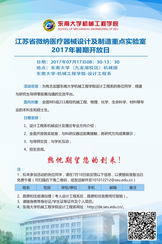 江苏省微纳医疗器械设计与制造重点实验室 2017年暑期开放日 通知