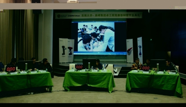 东南大学-泉峰集团第二期卓工班共有13位2014级机械工程专业同学。分成三队:百分之九十九队,水蜜桃队,闷声发大财队,就工艺,注塑和测量三方面所学知识进行必答和抢答竞赛。同学回答后,泉峰的导师再次进行详细讲解。竞赛后,每队再分别展现自己的小组设计并进行答辩。从产品设计到工艺方案、人机工程、成本分析控制等,体现了一个工程师必备的素质。答辩结束后,评选出本届卓工班的优秀小组和优秀学员,并进行颁奖和毕业典礼仪式。最后,王斌副书记对本次的卓工班进行了总结,带领学员向泉峰集团及各位老师表达感谢,同时对学员表达了殷切的期望。