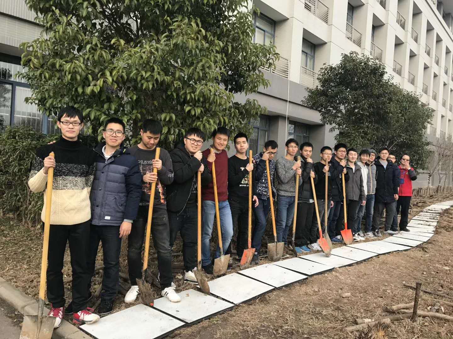 为了方便广大师生的通行,2018年1月17日下午,机械工程学院部分研究生在党委书记张志胜的带领下,在机械楼下将原本的篱笆路改造为石板路。