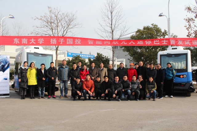 2018年2月2日上午,东南大学联合南京扬子国资投资集团有限责任公司在东南大学九龙湖校区举行合作运营的国内首辆智能网联无人迷你巴士的首发试运行,东南大学副校长吴刚教授,扬子国投集团董事长蔡龙,机械工程学院党委书记张志胜,学校相关部门负责人,以及巴士运营团队全体成员参加了首发试运行活动。发布会由机械工程学院副院长殷国栋教授主持。
