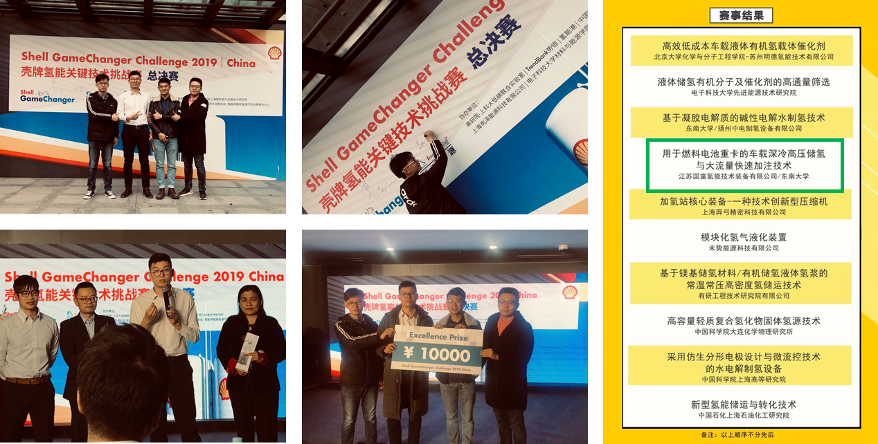 2019年11月26日,壳牌Game Changer 2019氢能关键技术挑战赛决赛在中科院上海高等研究院举办。本次大赛历时三个月,汇集了来自全球7个国家的83个氢能源领域提案。由球友会氢能装备研发团队与江苏国富氢能技术装备有限公司联合提出的“用于燃料电池重卡的车载深冷高压储氢与大流量快速加注技术”技术解决方案成功入围总决赛十强,并最终获得优胜奖(Excellence Prize)。