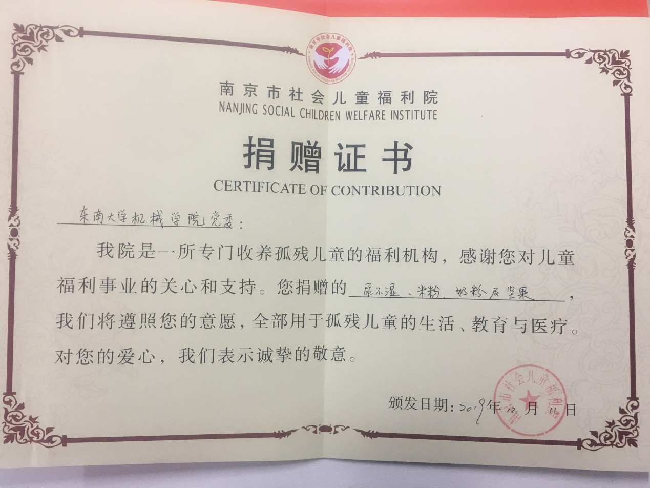图2 南京市社会儿童福利院向我院党委颁发的捐赠证书