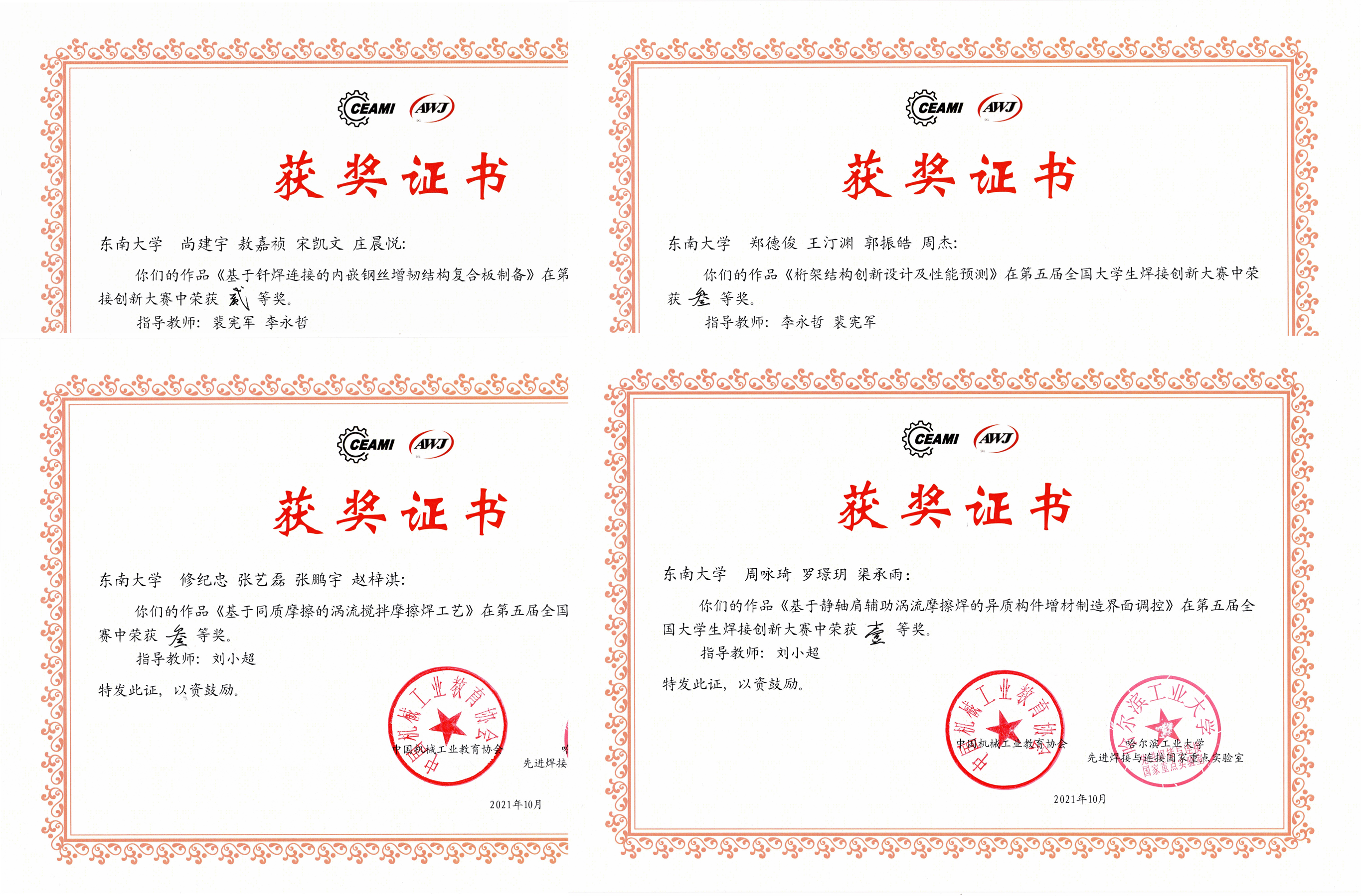 本次比赛采用线下作品性能测试与线上作品答辩相结合的形式进行。我校机械工程学院学生紧密结合赛事题目要求和焊接技术发展前沿,积极备赛,最终四支队伍晋级全国决赛。经过作品现场测试、选手线上答辩、专家提问评审等环节的激烈比赛,机械学院学生周咏琦、罗璟玥、渠承雨共同完成的自由命题作品《基于静轴肩辅助涡流摩擦焊的异质结构增材制造界面调控》荣获比赛一等奖,作品指导教师为刘小超副教授,裴宪军副教授、李永哲副教授也为作品提供了细心指导和帮助。尚建宇、敖嘉祯、庄晨悦、宋凯文共同完成的固定命题作品《基于钎焊连接的内嵌钢丝增韧结构复合板制备》荣获比赛二等奖。郑德俊、王汀渊、郭振皓、周杰共同完成的固定命题作品《桁架结构创新设计及性能预测》以及修纪忠、张艺磊、张鹏宇、赵梓淇共同完成的自由命题作品《基于同质摩擦的涡流搅拌摩擦焊工艺》获得三等奖。