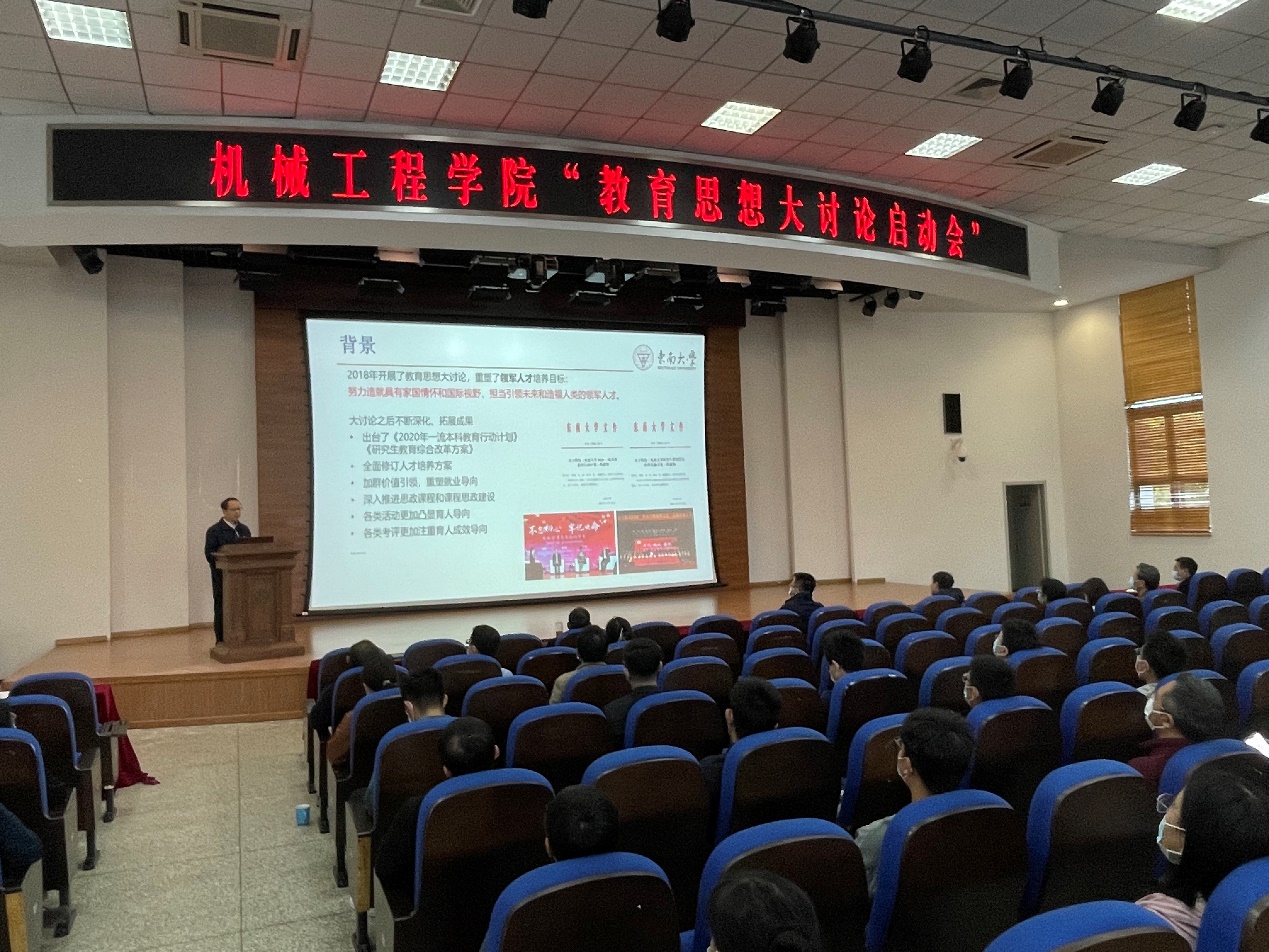 机械工程学院于2022年10月17日上午在九龙湖校区纪忠楼报告厅召开全院教职工大会,学院党委书记张志胜为全体教职工做了“立德树人的东大使命和生为首位的东大行动”教育思想大讨论启动报告,并做了师德师风专题教育。党委副书记王斌做了教育思想大讨论工作部署。倪中华院长做了“课比天大 生为首位”的总结报告。最后,学院新入职的教职工进行了自我介绍。