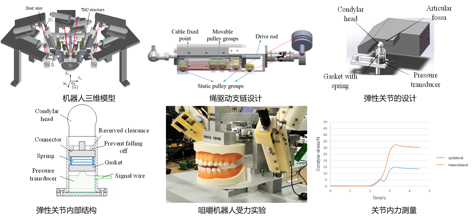 仿生咀嚼机器人在牙科医学、食品安全和假体修复领域具有广阔的应用前景。其中,人类颞下颌关节的仿生设计在复现人类咀嚼系统的运动与受力方面起重要作用。该论文提出了一种使用弹性元件的弹性约束关节,该结构使用弹簧来模拟颞下颌关节盘的粘弹特性,驱动支链采用低惯量、高刚度的绳驱动双向直线运动单元,通过弹性约束关节内置的传感器,可以测量出在不同咬合力下,咀嚼机器人运动时双侧髁突的受力。结果表明,这种弹性约束关节的设计进一步提高了机器人的仿生性能,并可以同时测量关节的内力变化。