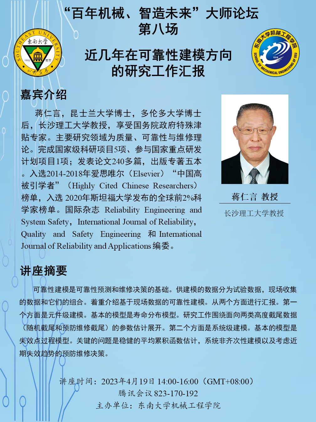 蒋仁言,昆士兰大学博士,多伦多大学博士后,长沙理工大学教授,享受国务院政府特殊津贴专家。主要研究领域为质量、可靠性与维修理论。完成国家级科研项目5项、参与国家重点研发计划项目1项;发表论文240多篇,出版专著五本。入选2014-2018年爱思唯尔(Elsevier)“中国高被引学者”(Highly Cited Chinese Researchers)榜单,入选 2020年斯坦福大学发布的全球前2%科学家榜单。国际杂志 Reliability Engineering and System Safety,International Journal of Reliability,Quality and Safety Engineering 和International Journal of Reliability and Applications 编委。