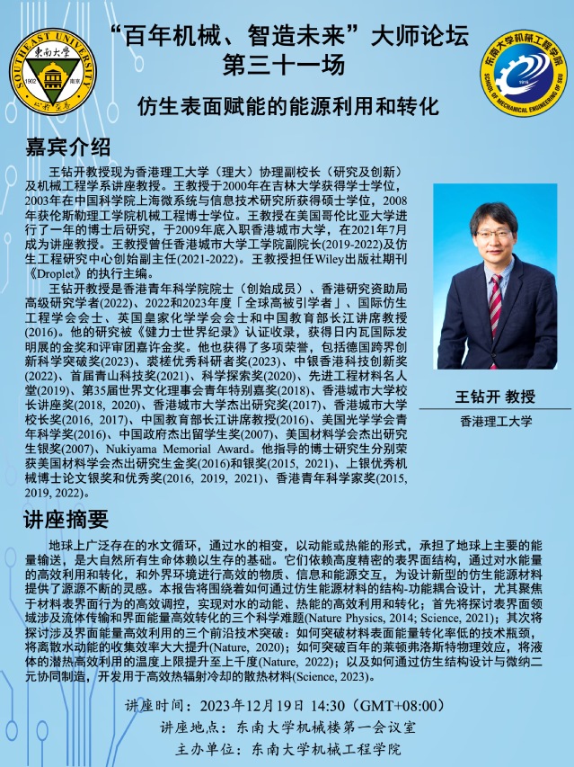 王钻开教授现为香港理工大学(理大)协理副校长(研究及创新)及机械工程学系讲座教授。王教授于2000年在吉林大学获得学士学位,2003年在中国科学院上海微系统与信息技术研究所获得硕士学位,2008年获伦斯勒理工学院机械工程博士学位。王教授在美国哥伦比亚大学进行了一年的博士后研究,于2009年底入职香港城市大学,在2021年7月成为讲座教授。王教授曾任香港城市大学工学院副院长(2019-2022)及仿生工程研究中心创始副主任(2021-2022)。王教授担任Wiley出版社期刊《Droplet》的执行主编。