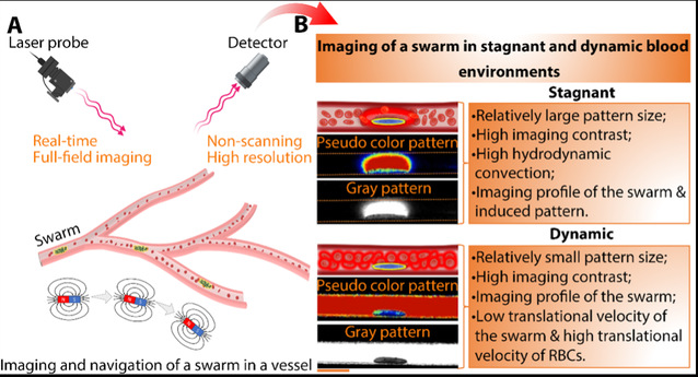 自然界中生物体自发的群体行为,如蚁桥搭建、细菌菌落增殖、鱼群和鸟群的运动等,是生物体躲避天敌、趋利避害的有效途径。通过对自然界中生物体群体行为的仿生研究,科学家们通过不同的控制方式实现胶体颗粒在微观尺度下的集群控制。其中,磁控微机器人集群(magnetic microswarm)在生物医学领域展现出巨大的应用潜力,这主要得益于其优越的主动操控能力、增强的成像对比度和可调控的环境适应能力。目前,在血液循环系统中实现微集群的实时定位追踪仍具有挑战性,主要存在以下亟待解决的关键问题:快速变化的血流破坏微集群的稳定性,难以实现集群的可控运动;缺乏对真实生理环境下微集群状态的高精度实时反馈策略,无法及时调整微集群的控制参数;缺乏即时描绘复杂血管结构的大面积成像方式,难以实现微集群的长距离导航和追踪。