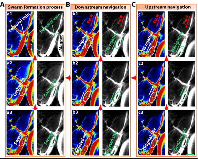 图 2. 活体实验鼠血管内微集群的实时追踪和导航
