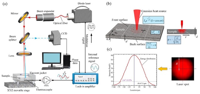 针对各向异性微米薄膜热测量的巨大应用需求,我院王建立教授课题组经过近3年的努力,开发了一种基于激光周期加热的测试系统,用于测量微米薄膜的各向异性热扩散率(图1)和热导率。论文连续发表在工程技术类TOP期刊《国际传热传质》( Int J Heat Mass Transf, JCR分区 1区)。有别于LFA和锁相红外技术,该测试方法将相位的空间分布分为线性和非线性区域,分别采用一维和三维热传导模型测量得到微米薄膜的面内和面外热扩散率。目前测试结果表明,该系统测试范围涵盖热扩散率:1×10−8 m2/s到1×10−3 m2/s,厚度:微米到毫米,温度:80K到500K。目前,通过与浙江大学、宁波材料所等国内诸多单位合作,该系统已经成功测量了包括石墨烯均热膜、聚酰亚胺薄膜、木制纤维薄膜等多种各向异性薄膜,对薄膜材料研发具有重要意义。