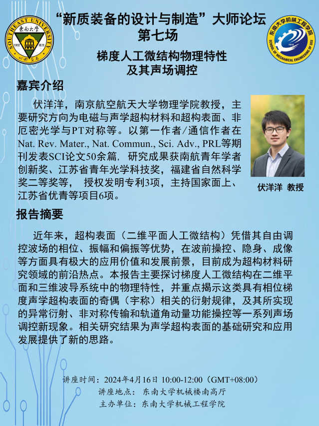 伏洋洋, 南京航空航天大学物理学院教授, 主要研究方向为电磁与声学超构材料和超构表面、 非厄密光学与PT对称等。 以第一作者/通信作者在Nat. Rev. Mater., Nat. Commun., Sci. Adv., PRL等期刊发表SCI论文50余篇, 研究成果获南航青年学者创新奖、 江苏省青年光学科技奖, 福建省自然科学奖二等奖等, 授权发明专利3项, 主持国家面上、江苏省优青等项目6项。