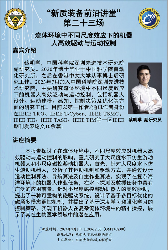 蔡明学,中国科学院深圳先进技术研究院副研究员。2020年博士毕业于中国科学院自动化研究所,之后在香港中文大学从事博士后研究工作。2023年7月加入中国科学院深圳先进技术研究院,主要研究流体环境中不同尺度效应下的机器人高效驱动与运动控制,包括机器人设计、运动建模、感知、控制决策及优化等方面的研究工作。目前以第一作者/通讯作者身份在IEEE TRO、IEEE T-Cyber、IEEE TSMC、IEEE TIE、IEEE TASE、IEEE TIM等一区IEEE期刊发表论文10余篇。