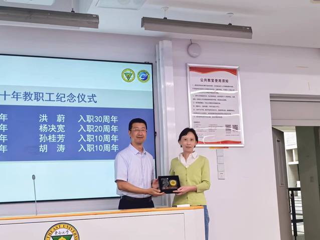 随后,举行了入职整十年教职工纪念仪式,机械工程学院费庆国院长为入职30年的洪蔚老师、20年的杨决宽老师颁发纪念牌,学院全体教师以热烈的掌声向这些辛勤付出的老师表达了崇高的敬意和由衷的感谢。