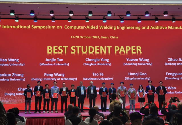 2024年10月18-20日,“第四届计算机辅助焊接工程与增材制造国际研讨会(The 4th International Symposium on Computer-Aided Welding Engineering and Additive Manufacturing, CAWE-AM 2024)”在山东济南举行。我院2023级博士生叶韬同学在导师刘小超副教授的指导下,凭借“Numerical simulation of the initial stage of vortex flow-based friction stir welding of Ti-6Al-4V titanium alloy”为题的论文获得最佳学生论文奖。