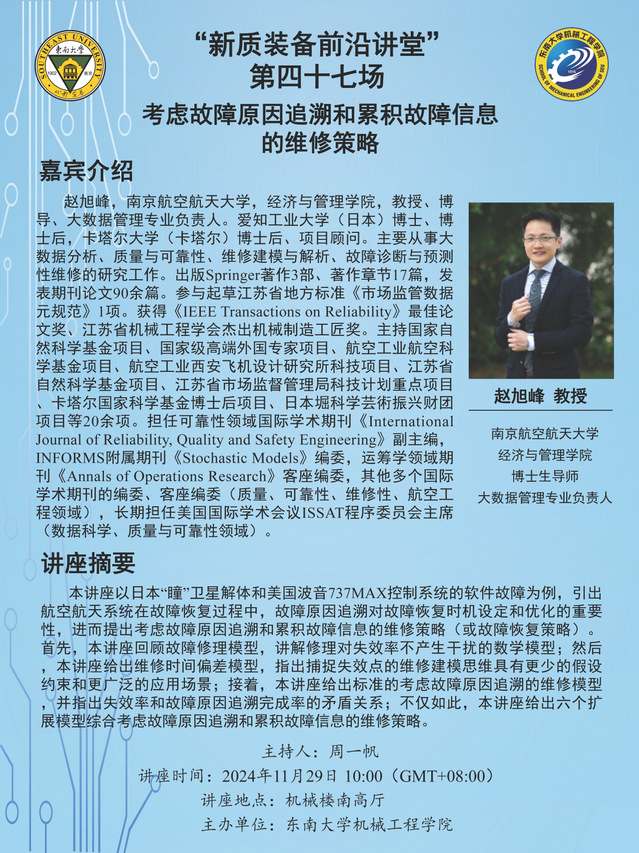 赵旭峰,南京航空航天大学,经济与管理学院,教授、博导、大数据管理专业负责人。爱知工业大学(日本)博士、博士后,卡塔尔大学(卡塔尔)博士后、项目顾问。主要从事大数据分析、质量与可靠性、维修建模与解析、故障诊断与预测性维修的研究工作。出版Springer著作3部、著作章节17篇,发表期刊论文90余篇。参与起草江苏省地方标准《市场监管数据元规范》1项。获得《IEEE Transactions on Reliability》最佳论文奖、江苏省机械工程学会杰出机械制造工匠奖。主持国家自然科学基金项目、国家级高端外国专家项目、航空工业航空科学基金项目、航空工业西安飞机设计研究所科技项目、江苏省自然科学基金项目、江苏省市场监督管理局科技计划重点项目、卡塔尔国家科学基金博士后项目、日本堀科学芸術振兴财团项目等20余项。担任可靠性领域国际学术期刊《International Journal of Reliability, Quality and Safety Engineering》副主编,INFORMS附属期刊《Stochastic Models》编委,运筹学领域期刊《Annals of Operations Research》客座编委,其他多个国际学术期刊的编委、客座编委(质量、可靠性、维修性、航空工程领域),长期担任美国国际学术会议ISSAT程序委员会主席(数据科学、质量与可靠性领域)。