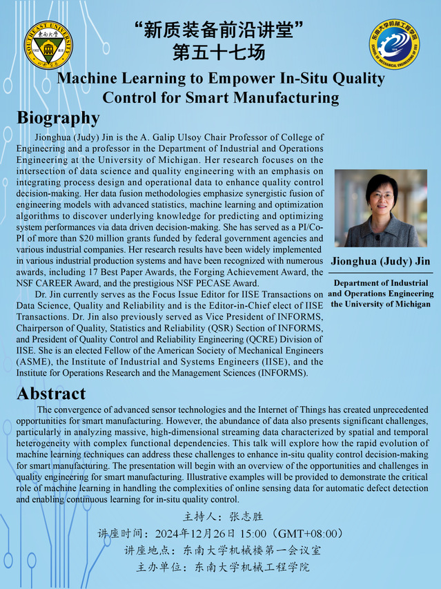Jionghua (Judy) Jin is the A. Galip Ulsoy Chair Professor of College of Engineering and a professor in the Department of Industrial and Operations Engineering at the University of Michigan. Her research focuses on the intersection of data science and quality engineering with an emphasis on integrating process design and operational data to enhance quality control decision-making. Her data fusion methodologies emphasize synergistic fusion of engineering models with advanced statistics, machine learning and optimization algorithms to discover underlying knowledge for predicting and optimizing system performances via data driven decision-making. She has served as a PI/Co-PI of more than $20 million grants funded by federal government agencies and various industrial companies. Her research results have been widely implemented in various industrial production systems and have been recognized with numerous awards, including 17 Best Paper Awards, the Forging Achievement Award, the NSF CAREER Award, and the prestigious NSF PECASE Award.