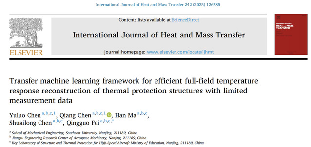 近日,我院航空航天系费庆国教授团队在传热领域TOP期刊《International Journal of Heat and Mass Transfer》发表题为“Transfer machine learning framework for efficient full-field temperature response reconstruction of thermal protection structures with limited measurement data”的研究成果,提出一种高速飞行器热防护结构三维时变温度场的在线重构方法。(论文链接:https://doi.org/10.1016/j.ijheatmasstransfer.2025.126785)