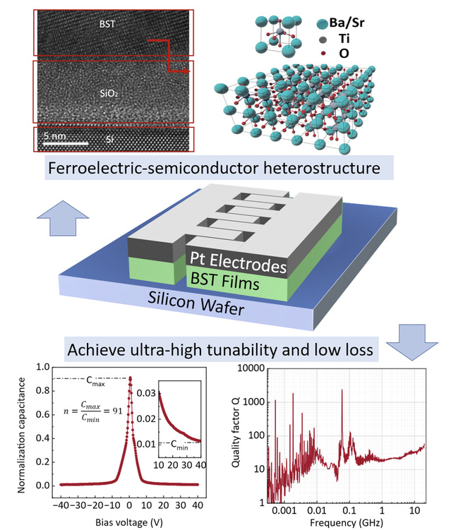 研究团队提出一种金属-铁电-半导体-铁电-金属(MFSFM)电容器,通过耦合铁电场效应与半导体场效应,突破传统铁电器件在电容可调率和低损耗间无法兼顾的局限。所制备的MFSFM电容器在40V偏压下实现可调性n值(Cmax/Cmin)超过90,同时Q因子高达1000,性能远超传统夹层结构(MFM)电容器。该器件采用磁控溅射直接在硅基底上制备BST薄膜,无需特殊基底可与CMOS工艺兼容,为可调滤波器与射频集成电路的大规模集成铺平道路。相关论文:《Ultra-tunable dielectric capacitors enhanced by coupling ferroelectric field effect and semiconductor field effect》(Appl. Phys. Lett. 2024)