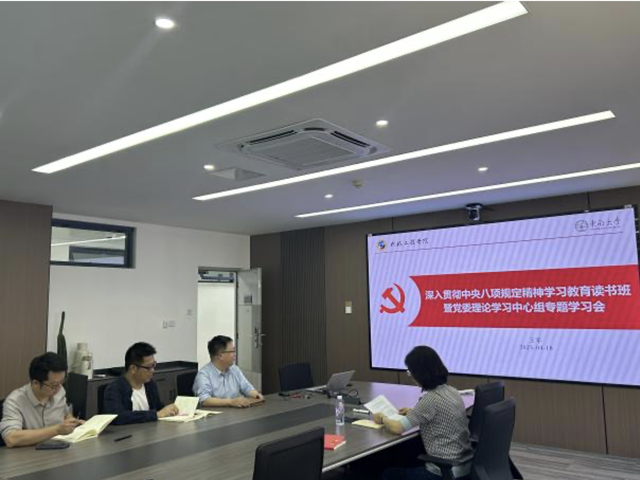 4月18日下午,我院举行领导班子深入贯彻中央八项规定精神学习教育读书班暨理论学习中心组集体学习会,学院领导班子成员参加了学习。