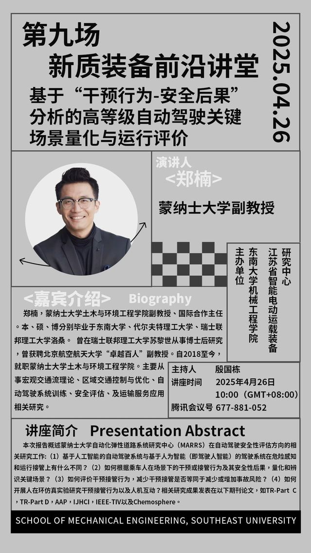 本次报告概述蒙纳士大学自动化弹性道路系统研究中心(MARRS)在自动驾驶安全性评估方向的相关研究工作:(1)基于人工智能的自动驾驶系统与基于人为智能(即驾驶人智能)的驾驶系统在危险感知和运行接管上有什么不同?(2)如何根据乘车人在场景下的干预或接管行为及其安全性后果,量化和辨识关键场景?(3)如何评价干预接管行为,减少干预接管是否等同于减少或增加事故风险?(4)如何开展人在环仿真实验研究干预接管行为以及人机互动?相关研究成果发表在以下期刊论文,如TR-Part C,TR-Part D,AAP,IJHCI,IEEE-TIV以及Chemosphere。 嘉宾介绍 郑楠,蒙纳士大学土木与环境工程学院副教授、国际合作主任。本、硕、博分别毕业于东南大学、代尔夫特理工大学、瑞士联邦理工大学洛桑。 曾在瑞士联邦理工大学苏黎世从事博士后研究,曾获聘北京航空航天大学“卓越百人”副教授。自2018至今,就职蒙纳士大学土木与环境工程学院。主要从事宏观交通流理论、区域交通控制与优化、自动驾驶系统训练、安全评估、及运输服务应用相关研究。
