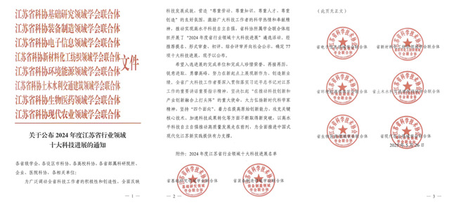 “江苏省行业领域十大科技进展”评选由江苏省科学技术协会发起,由江苏省科学技术协会所属基础研究、现代农业、环境能源等8大领域学会联合体共同组织,旨在遴选具有重大科学发现、突破“卡脖子”技术或实现产业转化的标志性成果。自2023年启动以来,已成为江苏行业科技创新的“风向标”、反映江苏科技创新实力的重要标杆。