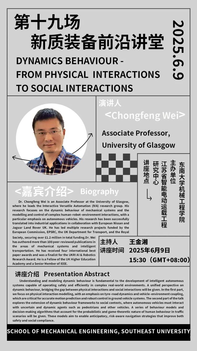 Dr. Chongfeng Wei is an Associate Professor at the University of Glasgow, where he leads the Interactive Versatile Automation (IVA) research group. His research focuses on the dynamic behaviour of mechanical systems and the modelling and control of complex human–robot–environment interactions, with a particular emphasis on autonomous vehicles. His research has been successfully translated into industrial applications in collaboration with European Nissan and Jaguar Land Rover UK. He has led multiple research projects funded by the European Commission, EPSRC, the UK Department for Transport, and the Royal Society, securing over £1.2 million in total funding. Dr. Wei has authored more than 100 peer-reviewed publications in the areas of mechanical systems and intelligent transportation. He has received four international best paper awards and was a finalist for the UKRI AI & Robotics Research Award. He is a Fellow of the UK Higher Education Academy and a Senior Member of IEEE.