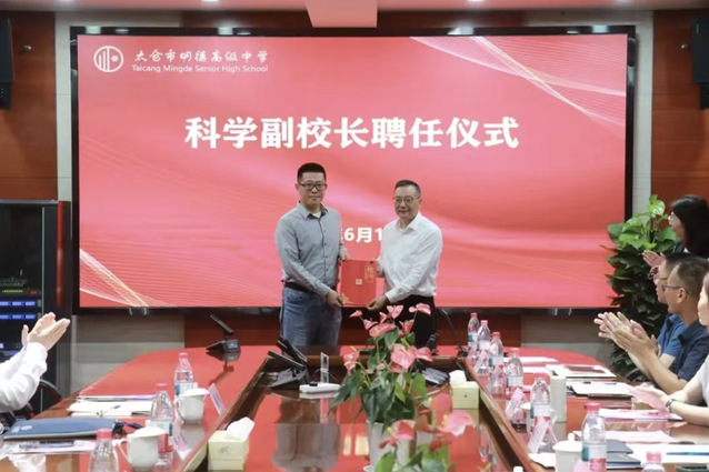 6月13日,太仓市明德高级中学开展科技特色建设专家指导活动。活动现场举行了科学副校长聘任仪式,球友会副院长孙东科教授受聘加盟太仓市明德高级中学科技教育团队,太仓市教育局局长李广耀为孙东科教授颁发科学副校长聘书。