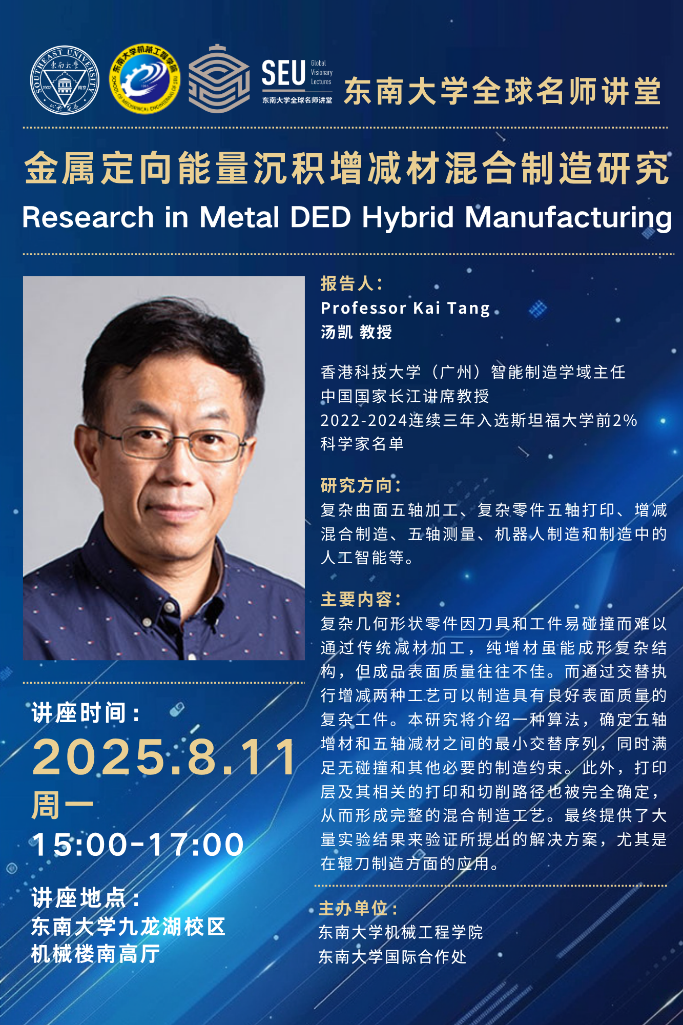 2025年机械学院“新质装备前沿讲堂”第二十二场:汤凯教授——金属定向能量沉积增减材混合制造研究