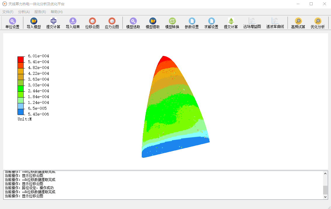 天线罩一体化仿真软件主要分为三个模块:天线罩力学分析模块、天线罩电磁性能分析模块(力-热-电一体化分析模块)、天线罩电磁性能优化模块,可分别对天线罩开展力学强度分析、力-热-电一体化分析、电磁性能优化分析。其中,力学分析模块集成了导入模型、提交计算、导入结果、位移云图显示、应力云图显示模块,可以根据用户的需要进行调用ABAQUS进行力学强度计算。电磁性性能分析模块集成了模型选取、模型提取、模型转换、参数设置、求解设置、提交计算、远场增益图、透波率曲线显示模块,可以根据用户的实际仿真需要选择电磁性能分析、力热电一体化分析。高频试算模块基于等效四端口理论,能够快速完成力热电一体化试算,用户可以根据实际仿真需求对电磁参数和强度参数进行设置,设置完成之后即可开展高频试算。优化分析模块基于粒子群优化算法,集成了透波均值最大、透波最小值最大、透波变异系数最小的三种优化目标,用户可以选择上述三种目标根据实际使用的需要,开展天线罩透波性能的优化。