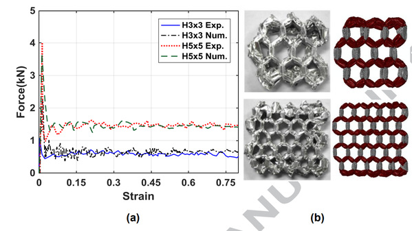 Fig. Validation of the modeling method: (a) Force-strain curves; (b) Deformation patterns.