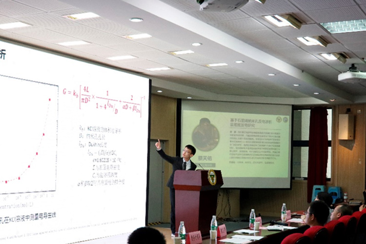 会议最后,3位评委老师上台为同学们颁发证书并合影留念,经评委老师讨论,蔡天佑同学“基于石墨烯纳米孔反电渗析盐差能发电研究”被推荐为本会场的“十佳报告”论文。