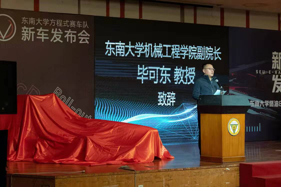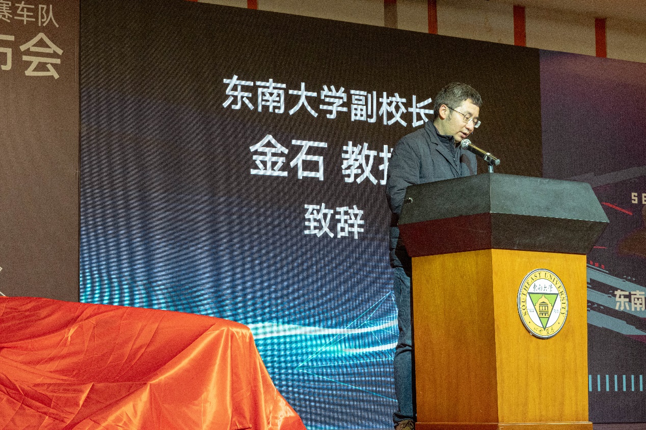 东南大学副校长金石致辞。发布会上,他对学生们开拓创新,自行设计制作的燃油与电动方程式赛车给予了高度评价,并对机械工程学院在创新创业方面取得的成绩给予了充分肯定。他希望东南大学燃油&纯电动方程式车队能够继续坚持“品质、精致、极致”的造车理念,发扬东大人特有的工匠精神、家国情怀,充分展现新时代大学生的风采,把车队打造得越来越好、越来越强!