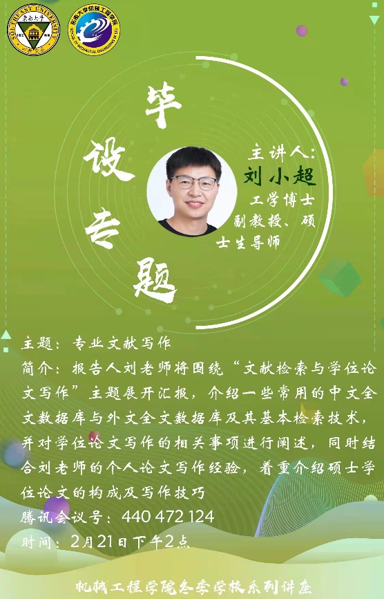 2月21日下午,毕业设计专题指导讲座第二场开讲,由机械工程学院副教授、硕士生导师刘小超老师带来内容为文献检索和学位论文习作的分享。刘老师首先详细地介绍了中英文全文数据库检索,包括数据库的定义、类型以及检索的逻辑等,很大程度上帮助同学们缩小了检索范围,提高检索的效率。此外,刘老师以自己的本科和硕士毕设论文为例,结合自己的亲身体会,按照论文框架结构,为同学们详细介绍了学士学位论文写作的规范和写作技巧。讲座的最后,刘老师期望同学们重视本科毕业设计,认真做好每一项工作,为以后的科学研究打下良好的基础。