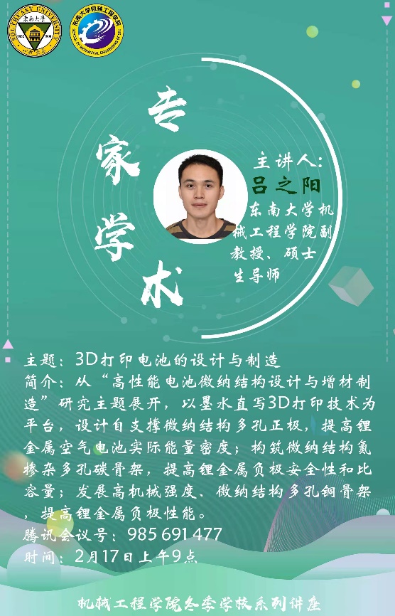 2月17日,球友会副教授吕之阳老师为同学们开展了一场关于3D打印技术的讲座。围绕着3D打印电池的设计与制造这一话题,吕之阳副教授通俗详尽地介绍了增材制造的技术定义,技术特点以及应用领域,并从未来可穿戴设备的发展及智能设备小型化的趋势,对体积更小、容量更大的电池的需求,结合3D打印电池的优越特点,高瞻远瞩地提出了3D打印在电池制造方面研究的必要性。最后,吕之阳副教授展示了自己在电池微纳结构的设计与3D打印构筑的具体成果,并对3D打印电池这一领域做出了积极的展望。