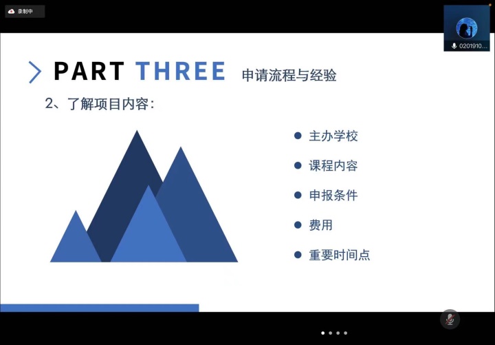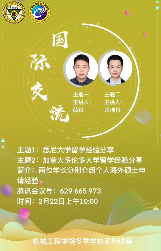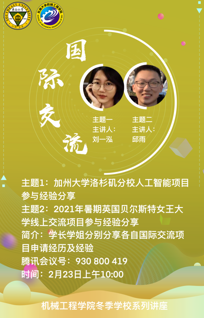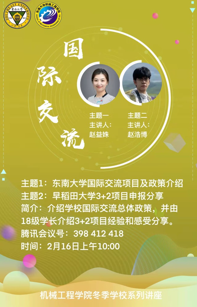 216日上午,国际交流讲座系列的首场讲座在线上开展,国际交流合作处的赵益姝老师以及2018级本科生赵浩博学长分别对东南大学国际交流整体政策、早稻田大学3+2项目进行了分享。赵老师主要对目前申报较多的交流项目进行了分析讲解,并概括了校内手续办理的一般步骤,对校内各部门的分工进行了简要介绍。最后,赵老师也对参加国际交流的目的进行了进一步概括,也希望同学们可以结合自身情况,选取最适合自己的项目。赵浩博学长则以早稻田大学的基本情况以及地理环境开题,讲述了所申报项目的学院构成及整个学期的具体时间安排和课程安排。最后,赵浩博学长对申报该项目的要求和所需的资料进行了概括,并对申报该项目的优势进行了分析总结,也希望感兴趣的同学可以积极参与。