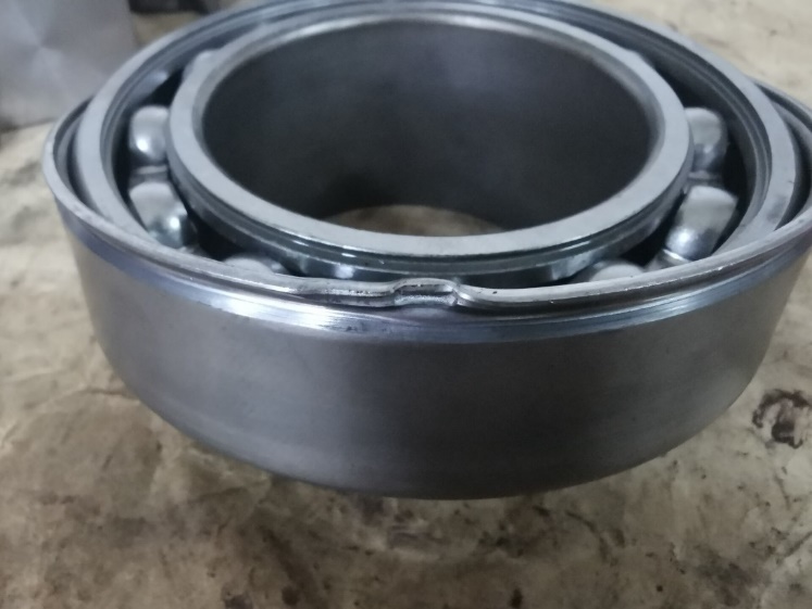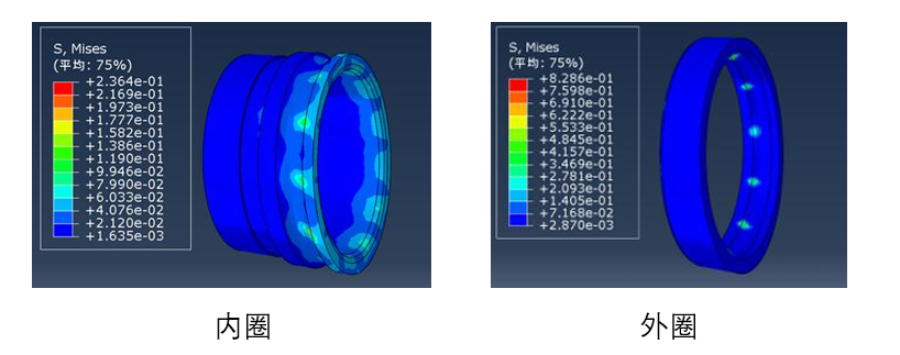 通过以上的应力分布图,我们可以发现,内圈与滚子的受力大小数量级在负1级,而外圈、外罩以及套筒的受力大小在正0级。因此,在考虑到各部位的失效形式的形况下,我们得出以下结论:在轴向拉力作用下,该轴承的主要失效部位为套筒与外罩的碾边处,失效形式为,外罩变形脱离。这与我们在实验室做的轴承拉伸实验基本一致,如图三。