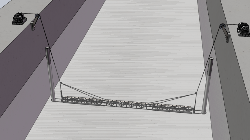 整体结构设计与仿真。对各个机构进行具体设计,并绘出三维模型,在此基础上进行了静力学仿真和流体仿真,仿真结果表明,桁架结构强度和刚度满足设计需求,且水流对桁架整体结构影响较小。同时,分段式设计可以满足不同宽度河道的需求。